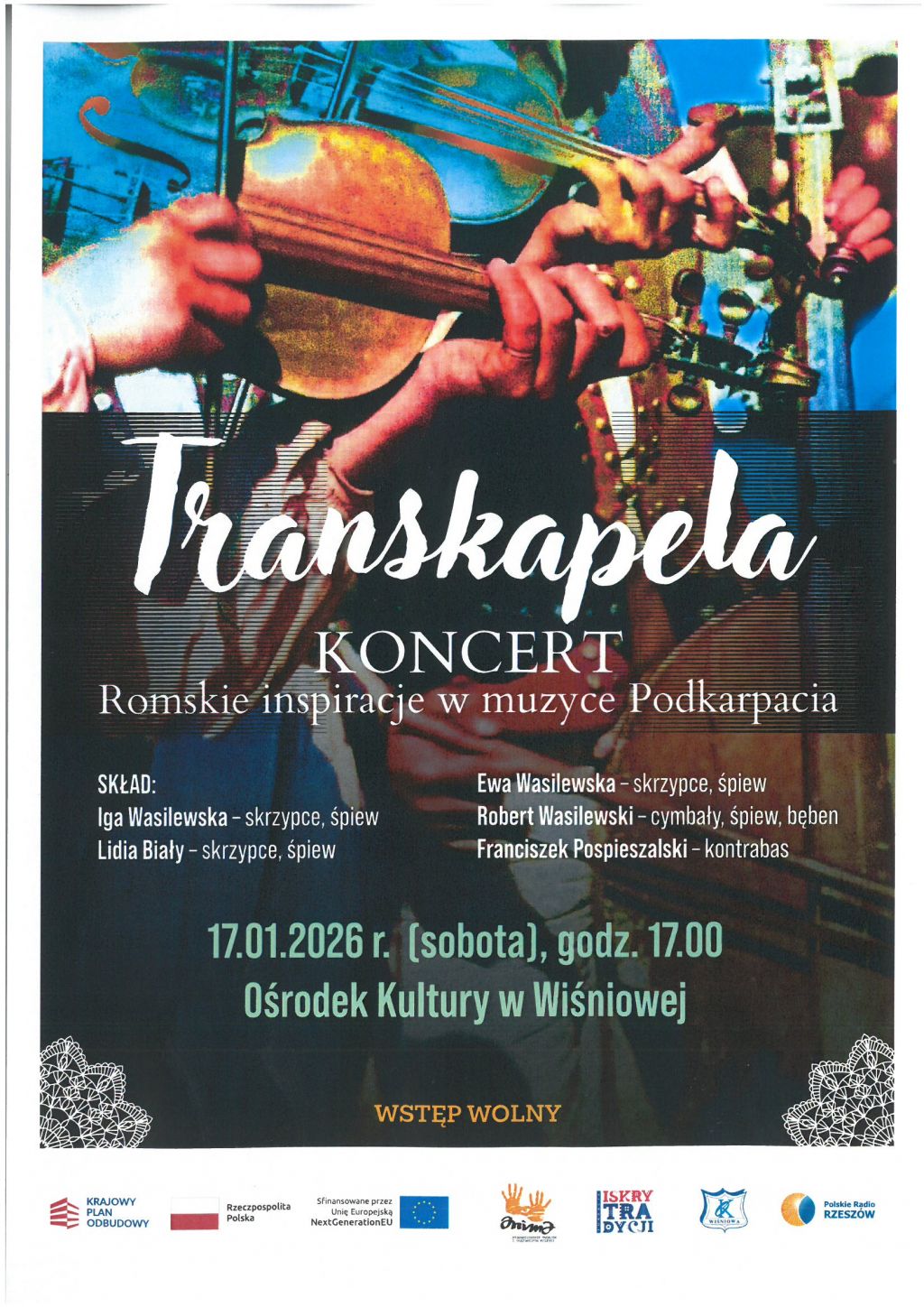 Ośrodek Kultury w Wiśniowej ma zaszczyt zaprosić na wyjątkowy koncert zespołu TRANSKAPELA[/b] pt. „Romskie inspiracje w muzyce Podkarpacia”